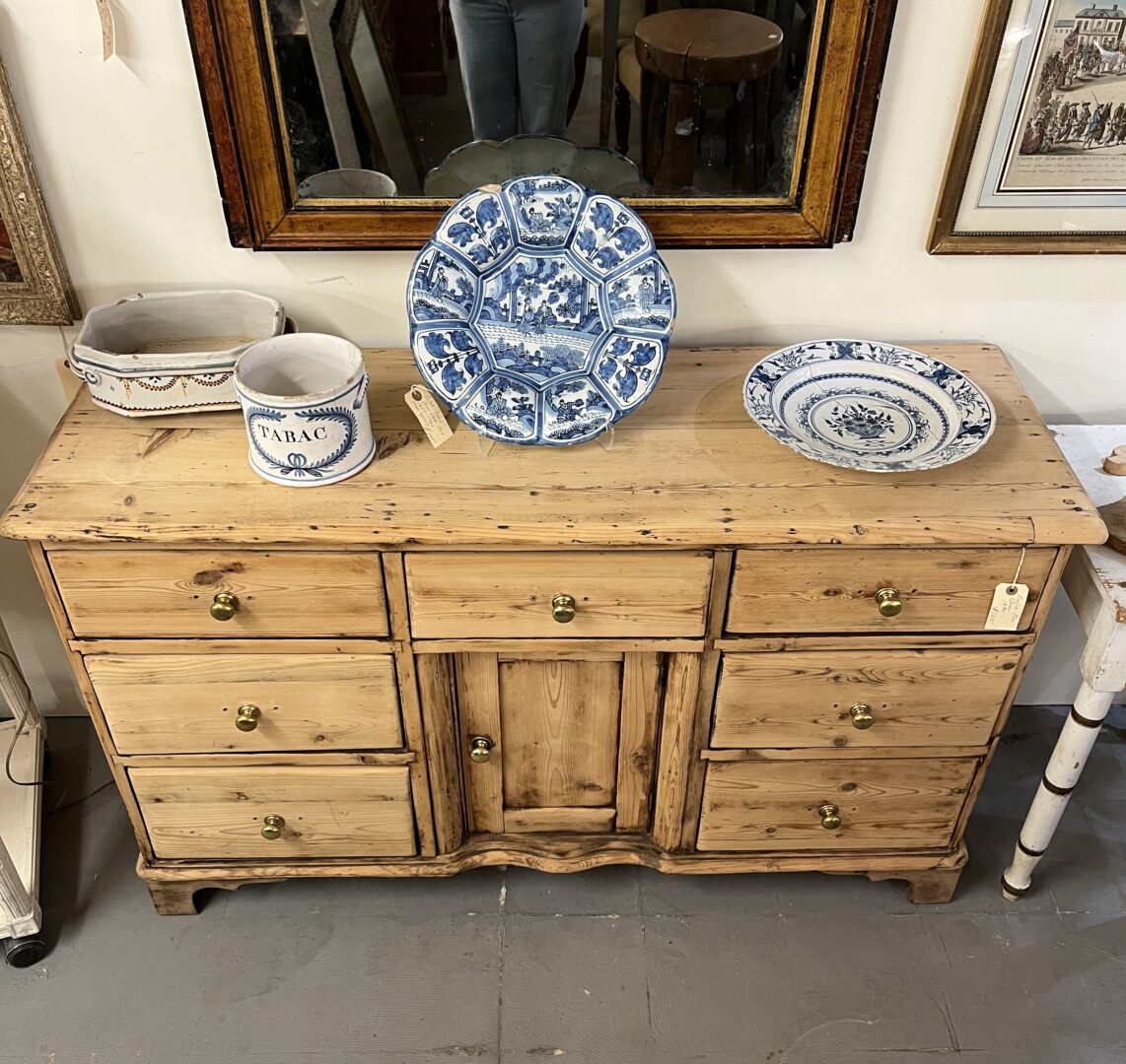 19th c. English pine server in dry sanded finish, with brass knobs.