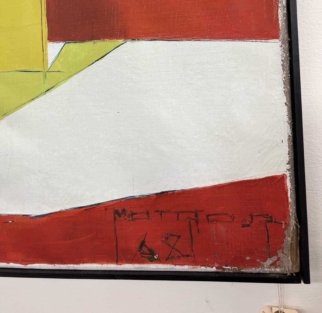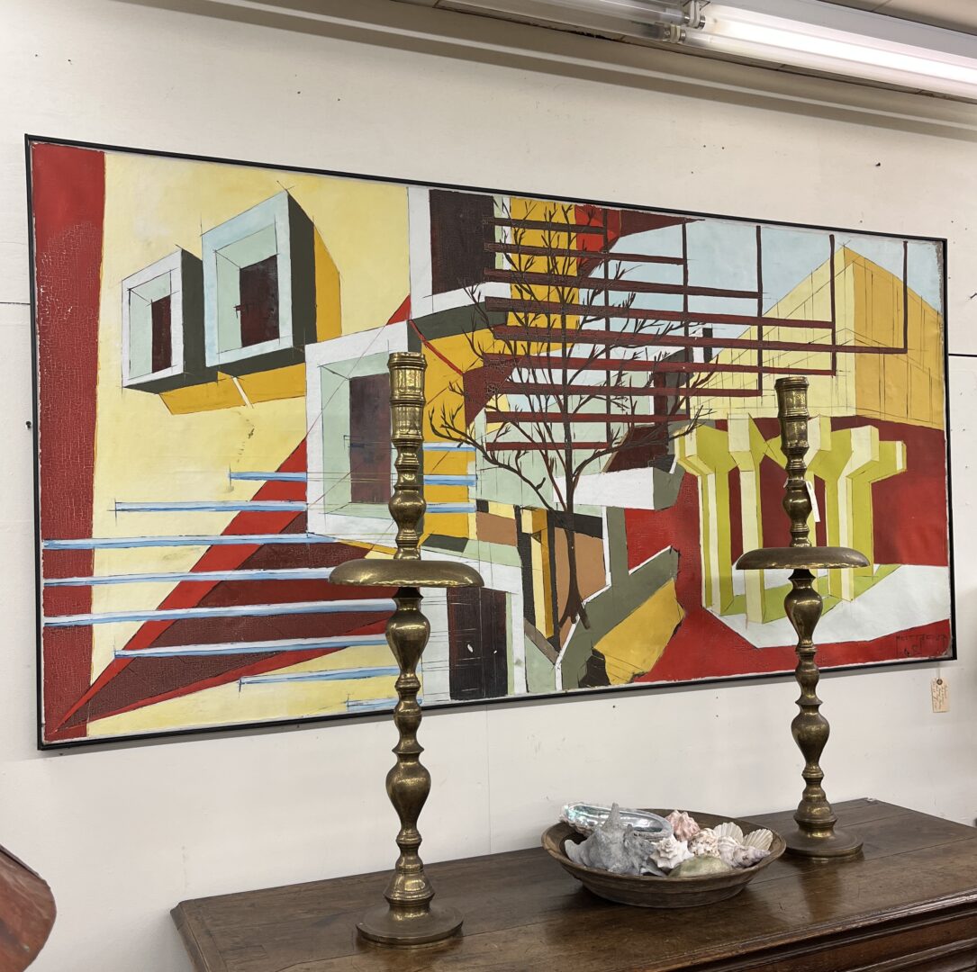 French modernist architectural themed painting. Signed and dated ‘68, oil on canvas with thin black frame.