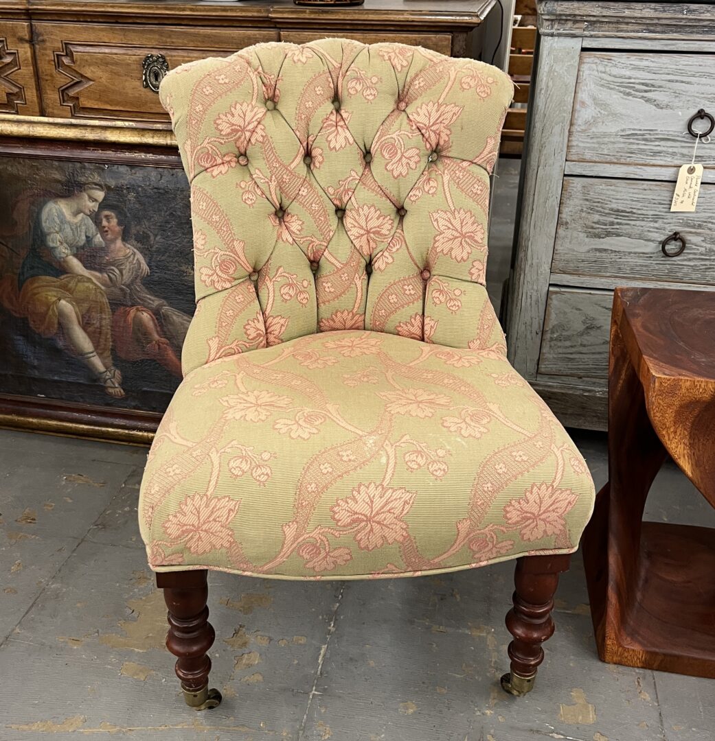Pair of slipper chairs with turned legs and flared tufted backs. Ready for reupholstery.